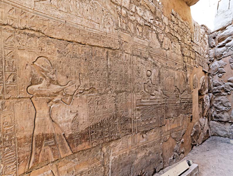 Vue de la chapelle de Khonsou : on voit que le mur du fond est très abimé.