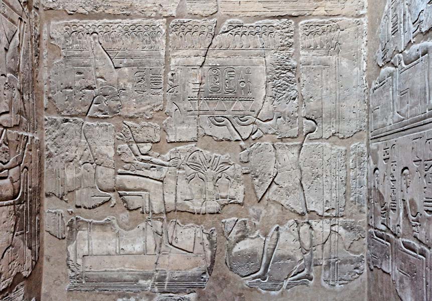 Mur du fond : le roi Ramsès II offre 4 vases à Mout.