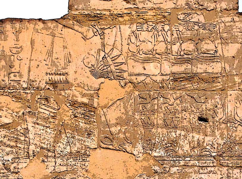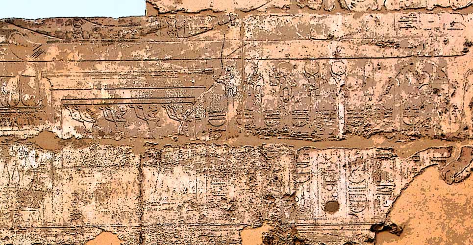 En haut, sur un socle, on devine une grande barque. En-dessous, de petits pharaons soutiennent le signe du ciel sous le socle. A droite, une série de pavois sont dressés, Oupouaout à l'avant et Horus à l'arrière. Les inscriptions sont très dégradées.