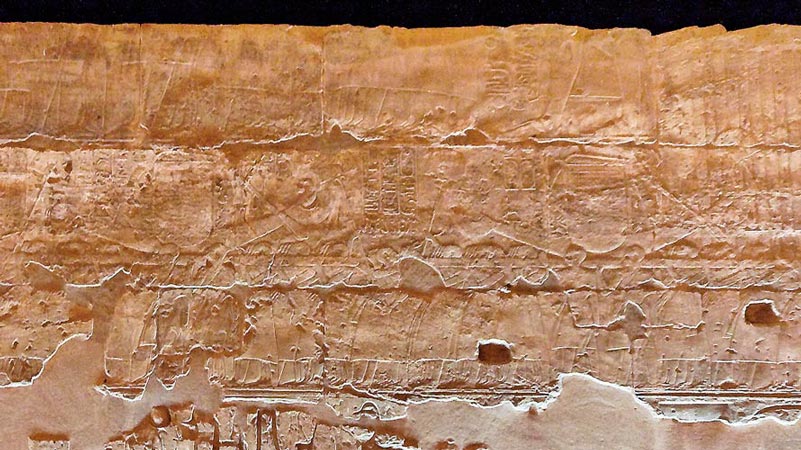Les barques d'Amon et Mout sont portées ves le Nil par des prêtres. Elles seront transportées vers le temple de Louxor par une barque spéciale.