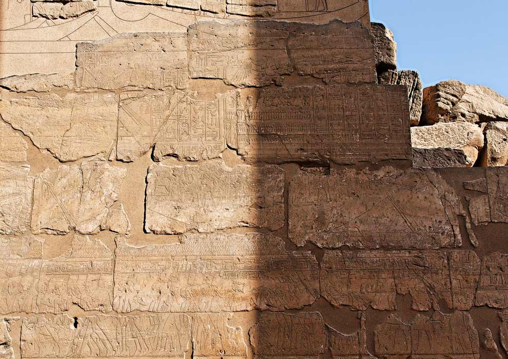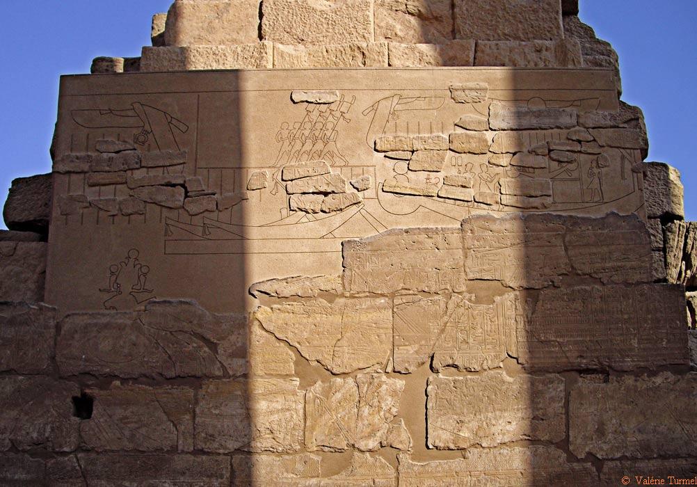 Au milieu,la barque d'Amon est transportée sur une grande barque qui navigue sur le Nil ou sur un canal. Au registre encore en-dessous, les soldats suivent sur la rive.