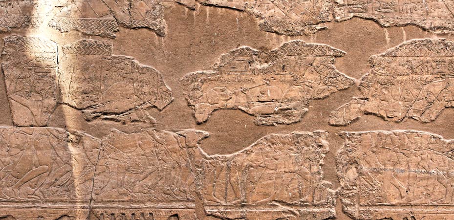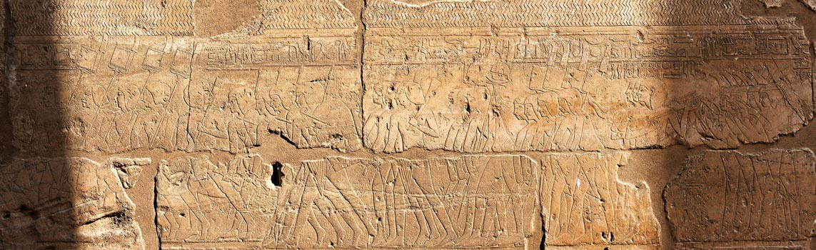 Sur l'autre rive, les soldats suivent la barque, avec, en tête, les portes-enseignes et , à la queue, desmusiciens avec des instruments à cordes et des claquoirs.