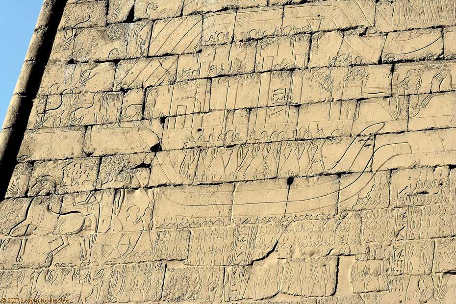 La ville de Qadesh ne sera pas prise par Ramsès. En bas à gauche, le roi des Hittites Muwattali II et son infanterie sont restés sur la rive orientale de l'Oronte. Figuré au milieu de ses troupes et prêt à se retirer, le roi se retourne en direction de Ramsès et reconnaît sa suprématie. (C. Obsomer) |