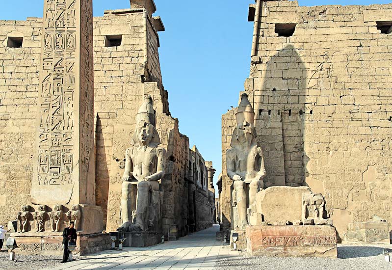 A droite, on peut voir la base de l'obélisque qui se trouve maintenant sur la place de la Concorde à Paris. Les deux statues de Ramsès II encadrent l'entrée. Par l'entrée, on aperçoit à gauche la mosquée Abou el-Hagag et dans le fond, la grande colonnade.