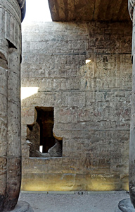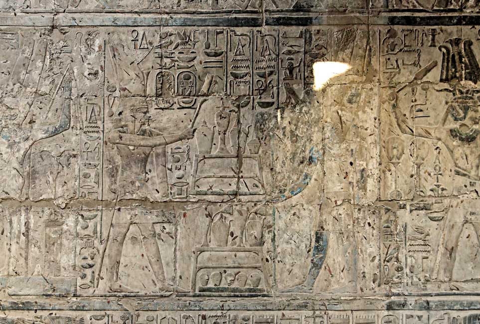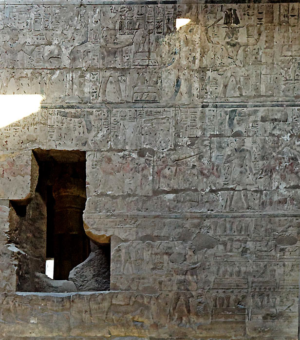 Scènes du mur est : ce panneau comprend des scènes d'offrandes à Amon, représenté ou non sous une forme ithyphallique et des processions de barques. Sur le registre du milieu, le roi avance devant la barque portée par des prêtres. une des scènes est montrée en plus gros plan ci-dessous.