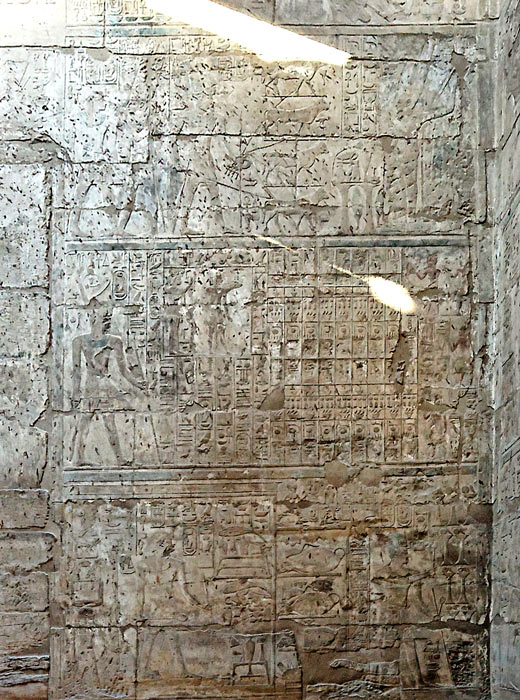 Mur nord côté est : sur le registre du haut, à gauche, le roi reçoit la vie d'Amon et à droite, il conduit 4 veaux, scène détaillée dans une page spéciale. Au milieu, le roi, précédé par de petites figures de prêtres, se tient devant une liste d'offrandes. En bas, sur la scène de gauche, le roi est suivi de son ka et sur la scène de droite, il consacre des feux de purification (voir là aussi une page spéciale).