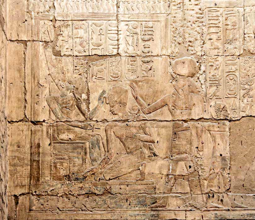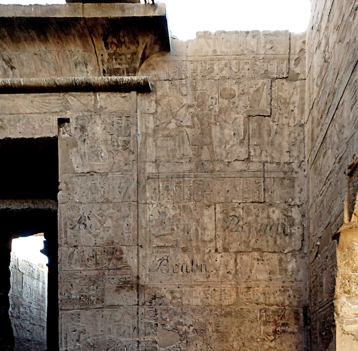 Mur sud, côté ouest : on retrouve le même type de scène que de l'autre côté de la porte. En haut, le roi est conduit par une déesse à tête de lionne et Amonet, puis il reçoit la vie d'Amon. En dessous, il est conduit par Montou et Hathor, avant de recevoir la vie. On voit les petites scènes entourant la porte.