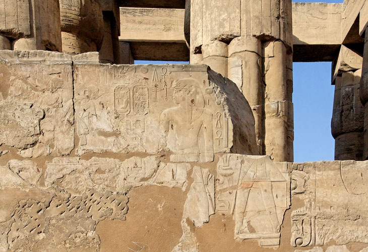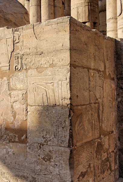 Cette scène se trouve à gauche du mur de séparation entre la salle du Roi Divin et la salle hypostyle attenante à la cour d'Amenhotep III. Les scènes sont très fragmentaires. A gauche, deux hommes s'inclinent devant le roi Amenhotep III. A droite, en bas, il semble que le cartouche ait été mis à l'envers.