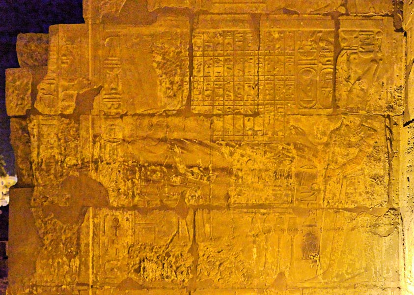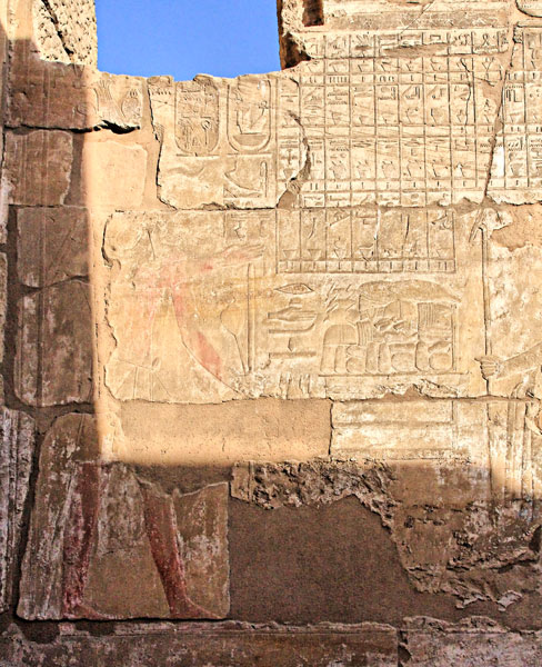 Mur est : ce mur comporte une porte au milieu dont on aperçoit l'ouverture à gauche.. De chaque côté, le roi consacre des offrandes à Amon, avec une liste de ces offrandes.