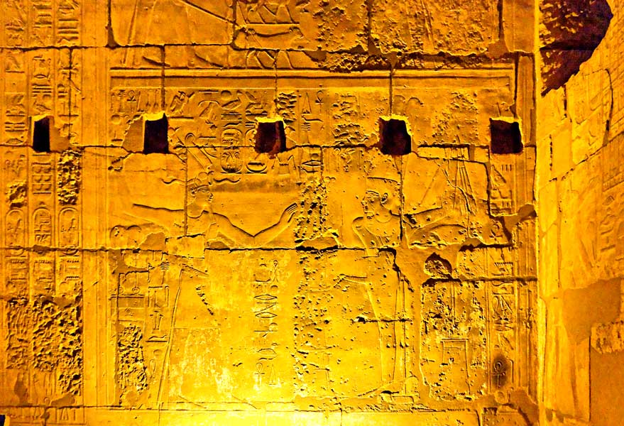 Scène du mur nord, en entrant à gauche : le roi est devant Amenope, divinité représentée comme Min, dont on voit l'emblème derrière lui. Au-dessus, partie d'une scène où le roi présente les 4 veaux. A gauche, une partie d'une scène du mur Est avec une liste d'offrandes.