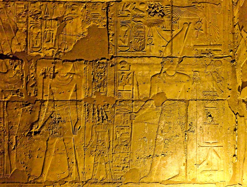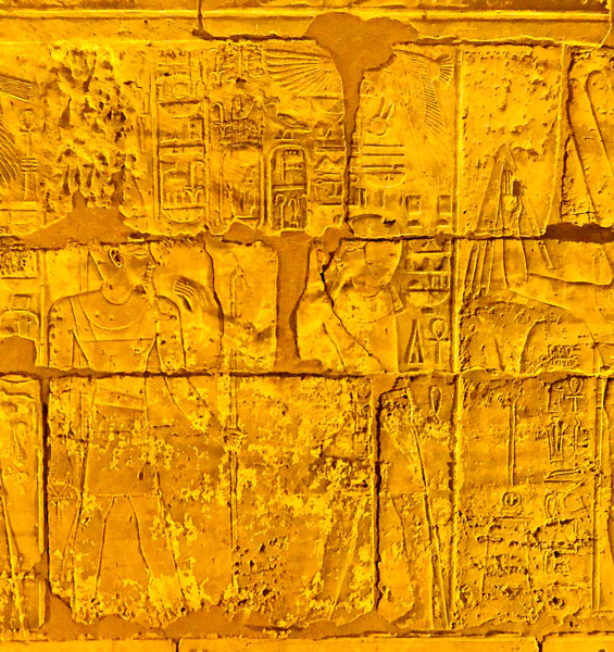 Mur ouest, 1ère scène en entrant à droite : à droite de la scène, le roi est accompagné de son ka, représenté sous une forme abstraite et portant un nom d'Horus du roi : "L'Horus, taureau puissant qui apparaît". A gauche, il est accompagné de son ka , représenté sous une forme anthropomorphe, image malheureusement un peu abimée, avec la même inscription au-dessus de son signe.