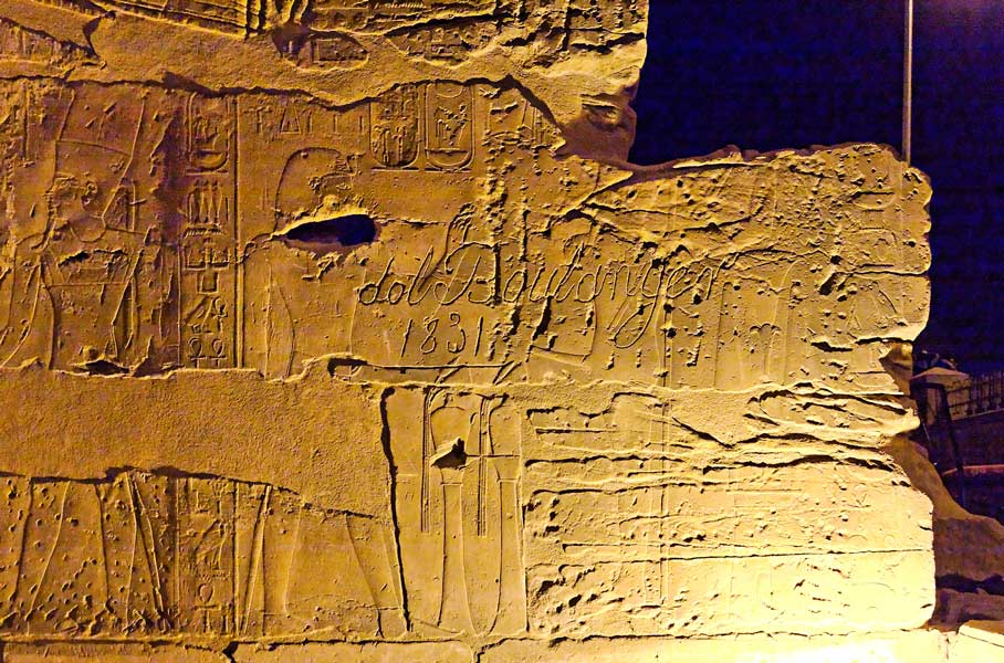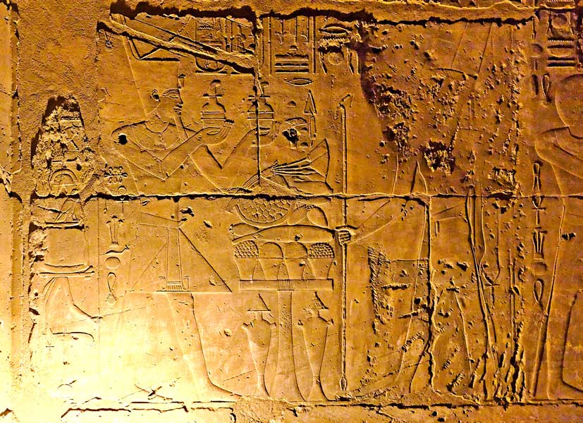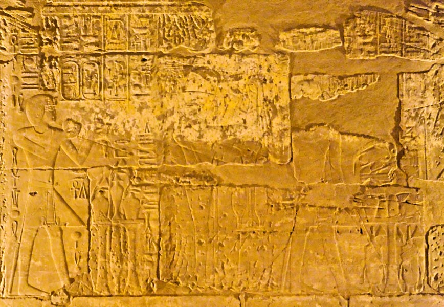| A gauche, le dieu Amon de la scène précédente. A droite, le roi se tient devant ce qui est apparement un grande table d'offrandes. Ce pan de mur se situe au bout du temple. |