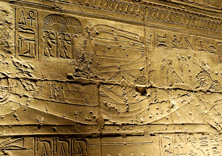 conduits vers l'aire du dieu pour que son orge soit parfaite. Le bâton que tient le pharaon est , en fait, les deux moitiés d'un ver qui détruit le grain et qui a été coupé pour que le grain soit parfait (J.P. Corteggiani). |