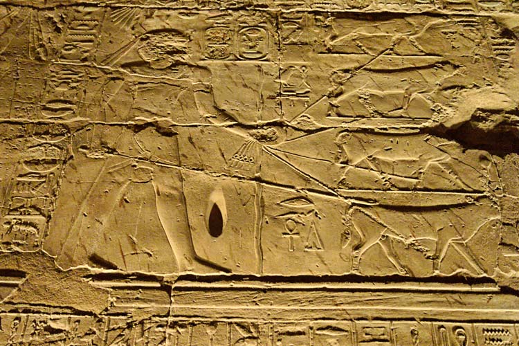 | Mur Est du sanctuaire, Registre du milieu : Aménophis III tient 4 veaux par des longes attachées aux pattes avants. Les veaux sont de couleurs différentes : tacheté, rouge, blanc et noir. Ce rite des 4 veaux a été représenté pour la première fois dans la pyramide de Sahouré de la Vème dynastie à Abousir, mais il est sûrement plus ancien. Il s'agit d'un rite d'origine agricole. Les veaux sont
