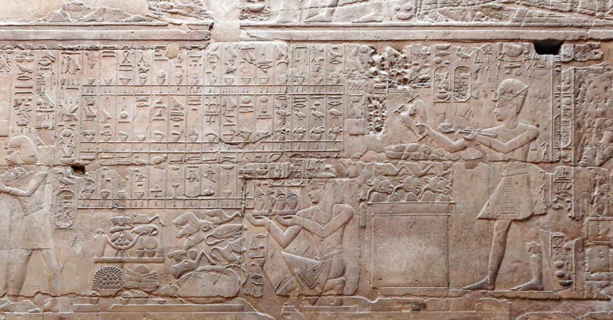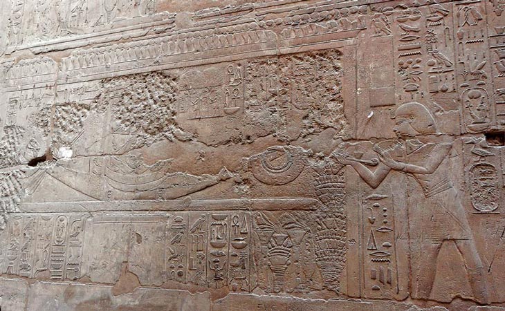 Mur Ouest, registre du bas : A droite, Aménophis III encense des offrandes sur un autel et verse une libation. Au milieu, il est agenouillé devant une liste d'offrandes et présente des offrandes.
