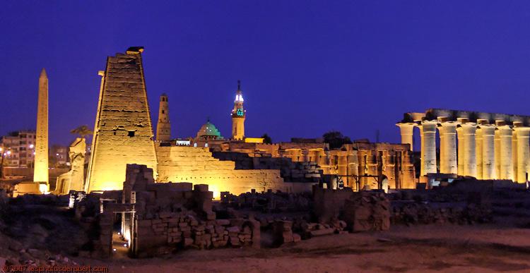 La vue du temple le soir produit toujours un effet saisissant sur le visiteur. Les murs d'enceinte et les plafonds ayant disparu, le visiteur aperçoit directement les colonnades. Le temple de Louxor est situé au milieu de la ville en bordure du Nil. Ce temple relève d’un plan assez homogène car il est principalement l’œuvre de deux pharaons, Aménophis III (XVIIIème dynastie) et Ramsès II (XIXème dynastie), à la place d’un temple plus ancien qui existait probablement sous Hatchepsout. Sur la photo, à droite, la grande colonnade érigée par Aménophis III et à gauche, le pylône, l’obélisque et les statues placés par Ramsès II. Au milieu, la mosquée Abou El-Hagag, construite au XIème siècle, tombeau du saint patron de la ville et qui n’a pu être démantelée. Ce temple était utilisé principalement lors de la « Belle fête d’Opet ». Complémentaire du temple de Karnak, ce temple, dit l"Ope du Sud" servait essentiellement à la régénération du dieu Amon qui venait de Karnak dans sa barque accompagné de Mout et de Khonsou. Ce site tente une description du temple de Louxor, de ses principales parties et des indications sur la « Belle fête d’Opet », à l'aide des scènes représentées sur les murs. Une partie est consacrée à la Théogamie royale. Une page spéciale permet de suivre les mises à jour et les ajouts effectués au cous du temps (page des mises à jour). |