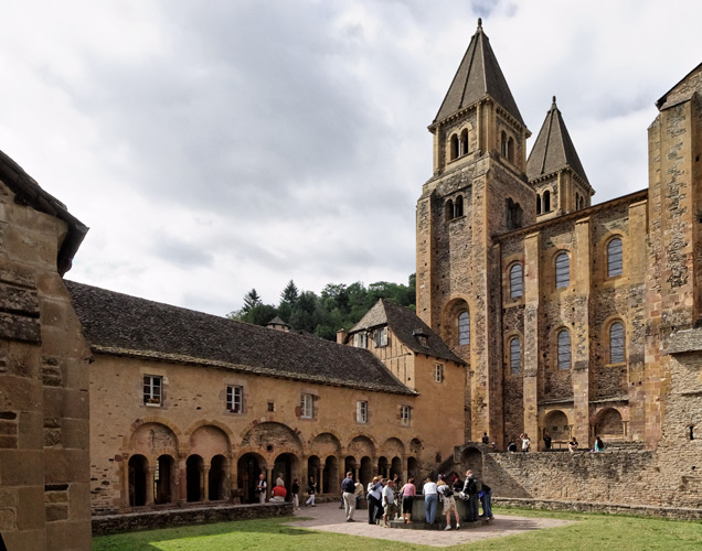 Les arcades de l'aile ouest subsistant du cloître. A droite, en bas, l'enfeu de Begon qui est installé le long du mur de l'église sous une petite arcade, entre deux contreforts.