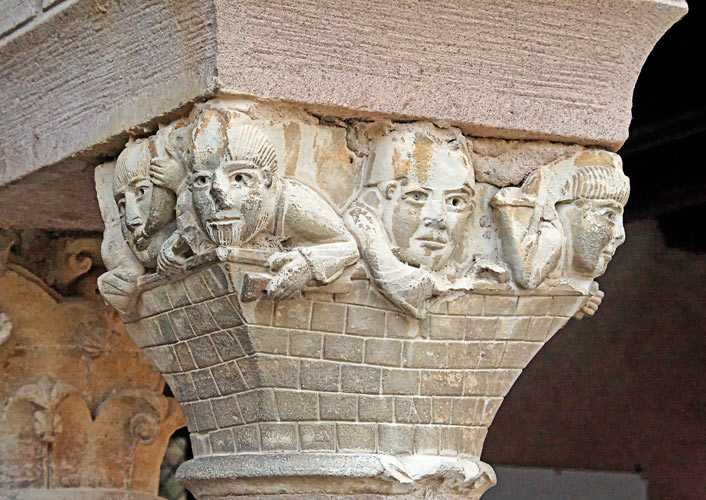 Corbeille d'un chapiteau en grès rose. Ce matériau était utilisé au début du chantier de l'abbaye.