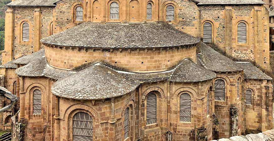 Le chevet le matin vu de l'est. Il présente un étagement pyramidal avec sept chapelles rayonnantes à la base : quatre pour le transept et trois autour du déambulatoire. Le toit de ce dernier est à peine visible entre les couvertures des chapelles. Puis vient le toit du passage aveugle qui permet de relier les deux côtés des tribunes. Enfin pour couronner le tout, le toit en faible pente de la voûte en cul-de-four. Le transept gauche et une partie du transept droit sont visibles. A leur intersection, se détache la tour de croisée.
