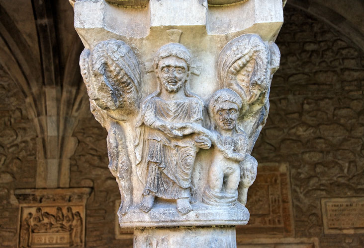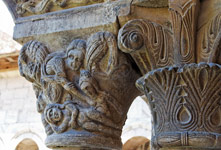 Chapiteaux XI et XII : si le premier a un décor classique à palmettes, le deuxième comporte un thème historié très rare en Roussillon. Il s'agit de la création d'Adam et Eve, ainsi que la scène du fruit défendu. |