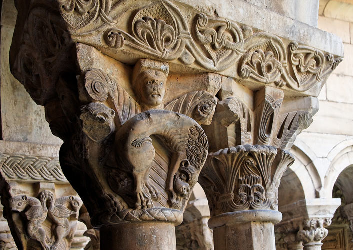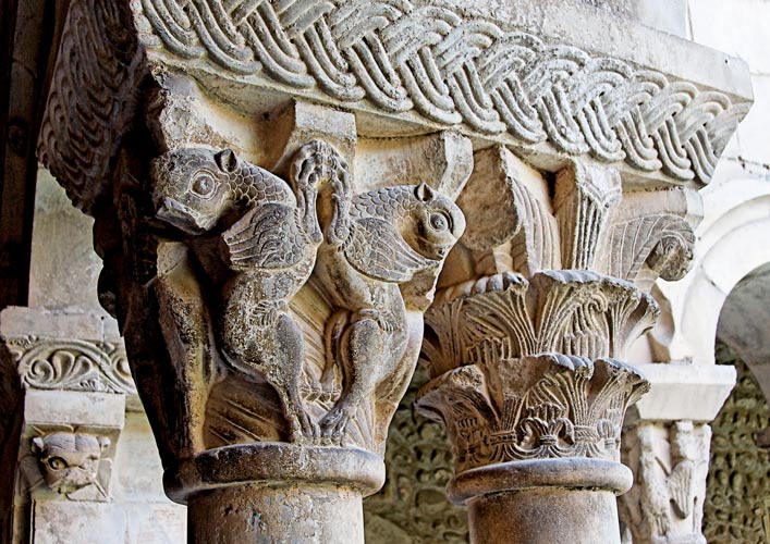 Chapiteaux III et IV : On retrouve là un des motifs classiques des ateliers du Roussillon à cette époque, avec ces lionnes recourbées. |