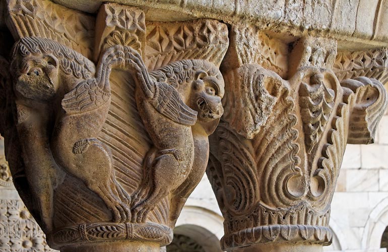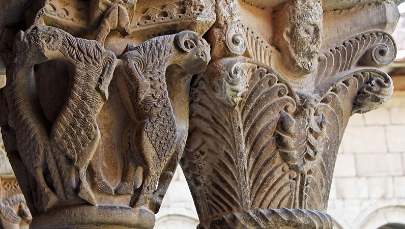 Chapiteaux VII et VIII : Bouquetins affrontés dressés sur leurs pattes et grandes feuilles d'angle avec têtes humaines au centre. |