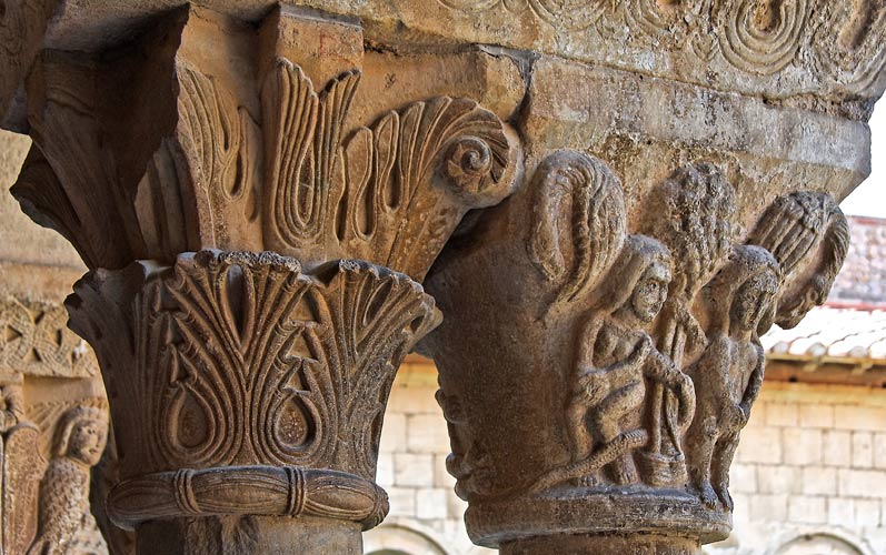 | A droite, la scène de la tentation est représentée sobrement. L'arbre et le serpent sont stylisés. Adam semble hésiter. Il couvre sa nudité. Il s'agirait du moment de la tentation de l'homme par la femme, représenté sans doute ici pour rappeler aux moines le rôle de la femme et les détourner d'elle. |