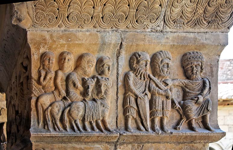 C'est la face sud de ce pilier. La scène pourrait s'inspirer d'un passage de la vie d'Hérode, soit avec les rois mages, soit en train d'ordonner le massacre des innocents. Le souverain reçoit des chevaliers, suivis de leurs écuyers. Il semble repousser le premier. Remarquez les plis du drapé d'Hérode. Les têtes semblent cependant disproportionnées par rapport aux corps. |