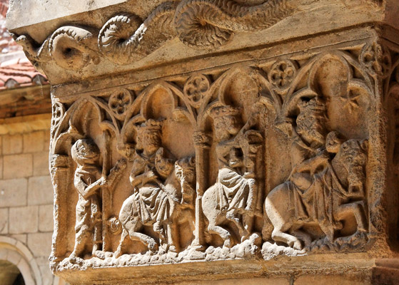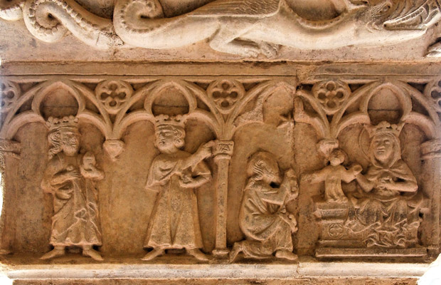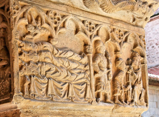 | Empilés sans souci de la perspective, les rois mages se reposent dans un même lit. A droite, Hérode ordonne le massacre des nouveaux nés, alors qu'un soldat s'apprête déjà à immoler un enfant avec son épée. |