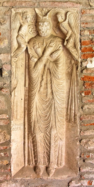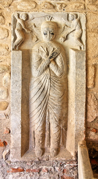Remarquez également les ailes des anges. A gauche, la pierre tombale en marbre blanc d'un évêque qui est peut-être Guillem d'Ortaffà (R. Grau, 1996). A droite, celle de F. de Soler, décédé le 16 janvier 1203, provenant du prieuré de l'Eule au Soler.