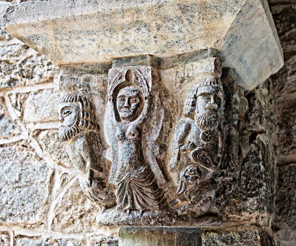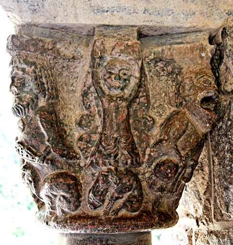 | Ce chapiteau (le 6ème à partir de l'entrée) a donné lieu à au moins deux interprétations. Certains y ont vu une représentation de la danse de Salomé qui demanda la tête de Saint-Jean Baptiste. D'autres y voient une évocation des péchés capitaux pour aguerrir les moines qui empruntaient les galeries du cloître. |