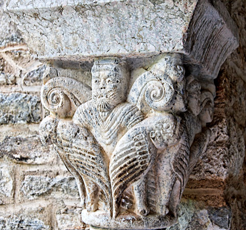 | Ces chapiteaux sont directement inspirés de chapiteaux de la galerie de Serrabona, quoique avec moins de détails et moins travaillés. Ci-dessus des lions et ci-dessous des aigles. |