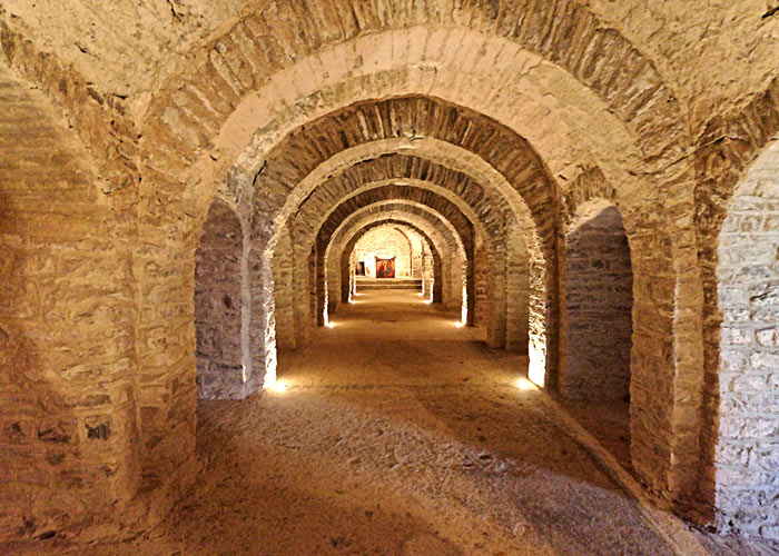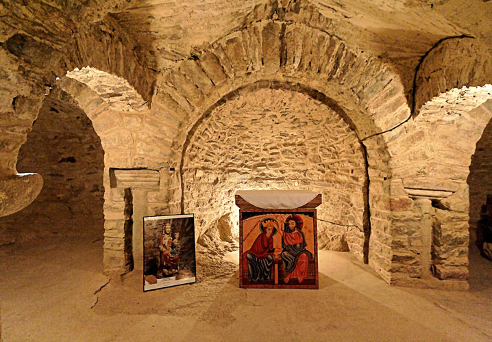 | L'église basse est dédiée à la Vierge. Les trois absides aveugles ont été taillées dans le rocher et correspondent à une 1ère phase de construction. Pour consolider l'ensemble, des colonnes furent noyées dans des massifs maçonnés lors de la construction de l'église haute. |