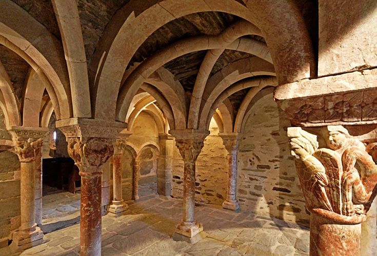Cette vue partielle de la tribune permet d'en admirer l'intérieur. L'iconographie des chapiteaux trouve en partie son origine dans les enluminures des Beatus, livres de commentaires de l'Apocalypse de Saint-Jean. Le nom vient du moine Beatus qui, en 776, au monastère de Liebana, écrivit le premier un tel commentaire. (d'après Jean Reynal).