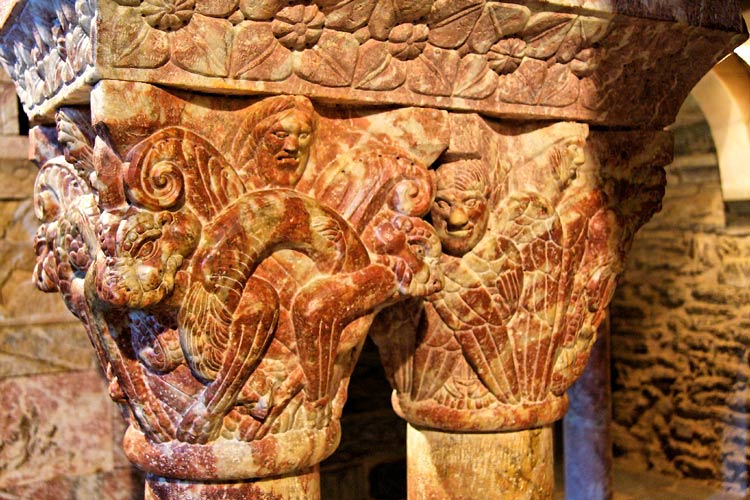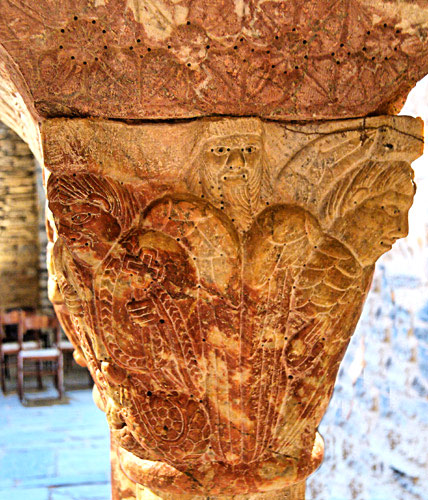| Sur le chapiteau de gauche, on retrouve les lions et le serpent enroulé qui mordille une patte. Sur le chapiteau de droite,un séraphin au nez épaté occupe l'angle. Il fait pendant au singe de l'autre côté. |