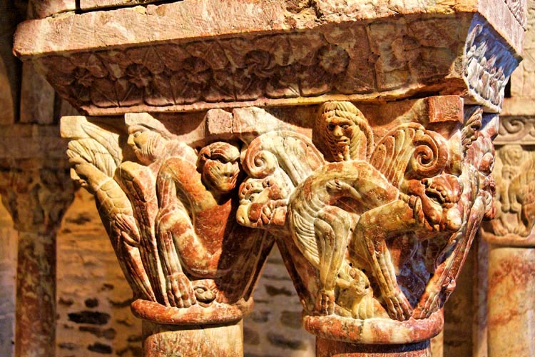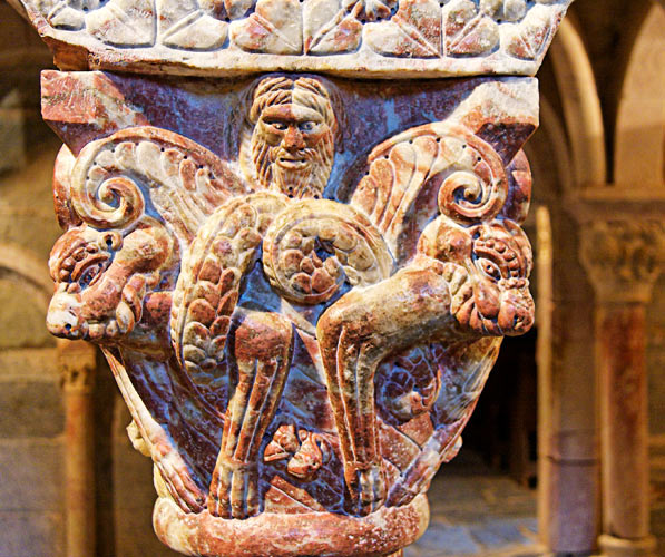 Les colonnes portent chacune un chapiteau. Sur celui de droite, les lions aux babines retroussées finissent d'engloutir les pattes d'un animal. Mais ici un serpent déroule son corps sinueux en une large volute. Serpent et singe, comme sur l'autre chapiteau, sont des représentations du Malin. Le singe est dans la même position obscène ou grotesque qu' à Cuxa. Il est assis sur une tête. A l'angle opposé, l'archange Saint-Michel. |