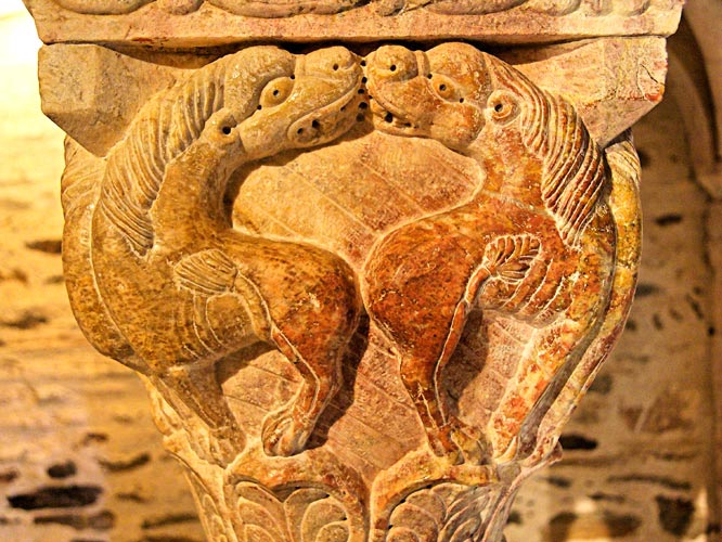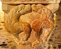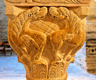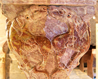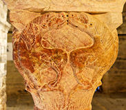 En déployant les quatre faces du chapiteau, on obtient le déroulement d'une frise. Chaque figure s'inscrit dans un cercle, qui est le guide pour le sculpteur. Les lions ne sont qu'un élément de décoration.