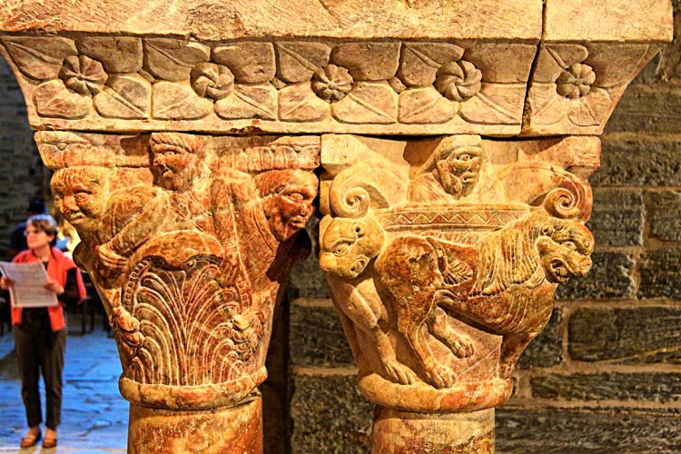 Sur le chapiteau de gauche, les figures d'angle seraient une représentation d'un moine à gauche et d'un paysan à droite.
