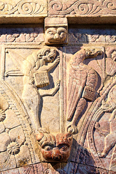 | Le lion de Marc et l'aigle de Jean tiennent dans leurs mains les évangiles où se sont inscrits leurs noms en latin. Ces deux figures sont sculptées en relief. En dessous, un modillon à gueule de lion. |