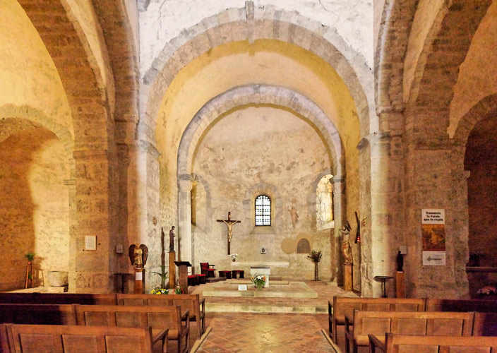 .L'abside centrale, précédée d'une travée droite est plus large et plus profonde que les absidioles de côté. La piètre qualité de la photo est due à la faible lumière à l'intérieur de l'église.