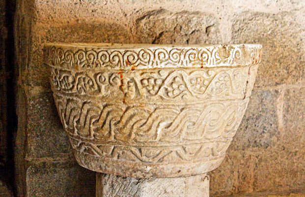 Bénitier ou cuve baptismale, ce réceptacle est richement décoré.