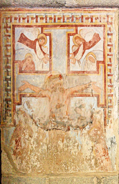Ce fragment de peinture murale recouvre un des piliers. Il daterait du XIIème ou XIIIème siècle. Le haut de la croix fait penser aux représentations de la croix dite de Saint-André.