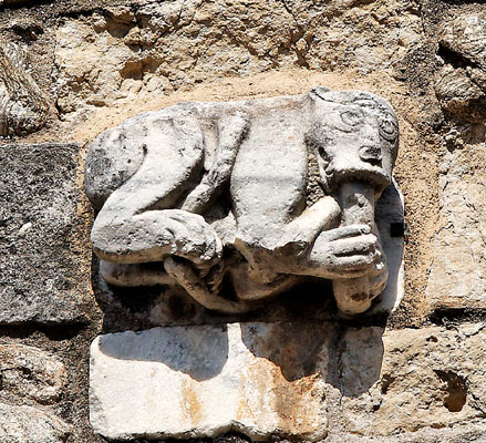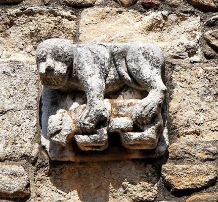 Au-dessus du portail, deux lions sont sculptés en haut-relief. Ils sont représentés en train de dévorer des animaux. Celui de gauche est un serpent. C'est la victoire du Bien sur le Mal. Les lions jouent ici un rôle protecteur.