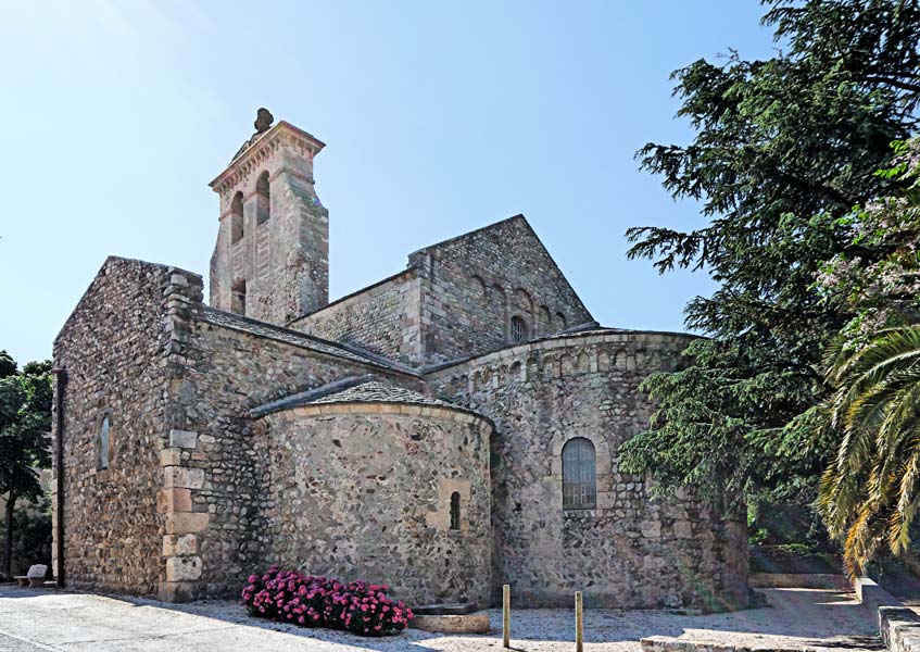 .Fondée à l'époque de Charlemagne, l'abbaye de Saint-André eut du mal à subsister. Cloître et dépendances ayant disparu à le Révolution, seule subsiste l' église. Les études permettent de distinguer trois étapes de construction. De la plus ancienne, au Xème siècle, datent le plan en croix latine et les assises des murs en opus spicatum (en arêtes de poisson).. Les maçons de la 2ème campagne ( vers 1020) utilisèrent des matériaux différents, de petits moellons cassés au marteau. Le décor de la façade daterait de cette période. Vers le début du XIIème siècle, avant la consécration, la 3ème période vit le couvrement en voûte en berceau. L'abside principale est plus profonde que les absidioles de côté.