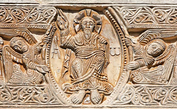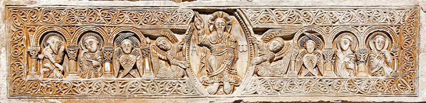 Le Christ semble se tenir droit. Sa tête est auréolée d'un nimbe crucifère. De la main droite il bénit. La main gauche tient un livre. Il est l'Alpha et l'Oméga, comme l'indiquent les deux lettres gravées, en référence à un passage de l'Apocalypse. La sculpture est plus affirmée que dans le linteau de Saint-Genis. La profondeur de la taille est de 1 cm. Les corps sont plus marqués, notamment les genoux. Les plis des tissus sont plus finement gravés. |
