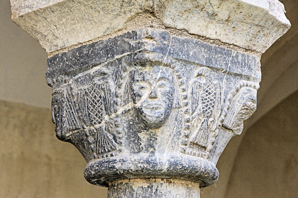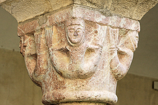 Chapiteau en marbre rose, classique de l'iconographie médiévale : 4 sirènes placées aux angles saisissent de leur main leur double corps. Ce thème rappelle aux moines qu'ils doivent combattre les aspects multiformes du mal ( notamment sans doute sous l'aspect des femmes). |