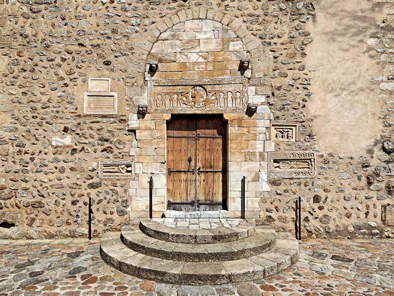 Le linteau au-dessus de la porte de l'église est une pièce en marbre blanc de Céret, de 2,21 m de long sur 0,70 m de large et 18 cm d'épaisseur. Il représente le Christ soutenu par des anges et entouré d'apôtres. Les modillons saillants autour du linteau servaient autrefois à supporter un auvent abritant la sculpture. De part et d'autre de la porte, peuvent se voir des inscriptions funéraires. Vous pouvez avoir plus de détails en utilisant la barre