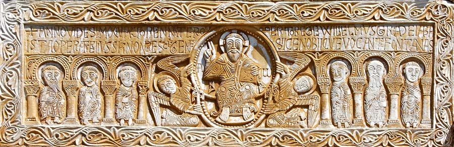 | La célébrité du linteau vient notamment de l'inscription qui permet de le dater avec précision. "Anno videsimo quarto reenante Rotberto Rege.." Le roi auquel il est fait référence est le roi des Francs qui restait une référence au moins diplomatique, même si les liens des puissants de la région avec celui-ci étaient très distendus. La 24ème année de son règne s'étend d'octobre 1019 à octobre 1020, date très précoce pour la sculpture romane. L'inscription et les personnages sont entourés par une bande de grandes palmettes taillées en biseau. Remarquez que le Christ n'est pas tout-à-fait au centre du linteau : la première colonnade de gauche est plus épaisse que la dernière à droite et le premier personnage à gauche est plus volumineux que les autres. L'artiste a sans doute commencé son travail par la gauche. |