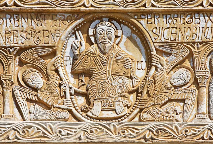 | Le Christ trône au centre, dans une gloire perlée composée d'une mandorle et d'un globe terrestre sur lequel siège le Seigneur. Le Christ est entouré de deux anges qui tiennent l'ensemble. On le verra plus nettement encore sur les côtés, mais le terme de "sculpture" ne peut vraiment s'appliquer qu'à certaines parties et notamment aux ailes des anges qui occupent plusieurs plans, au lieu des deux plans que les figures occupent. Sur le plan supérieur, les traits et les membres sont plus calligraphiés que sculptés. Le marbre n'est creusé que de 5 mm. |