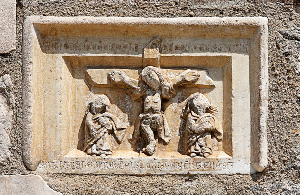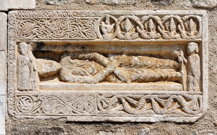 A droite de la porte, la pierre épigraphiée de Frère Miquel, abbé de 1271 à 1281 et décédé en 1307. |